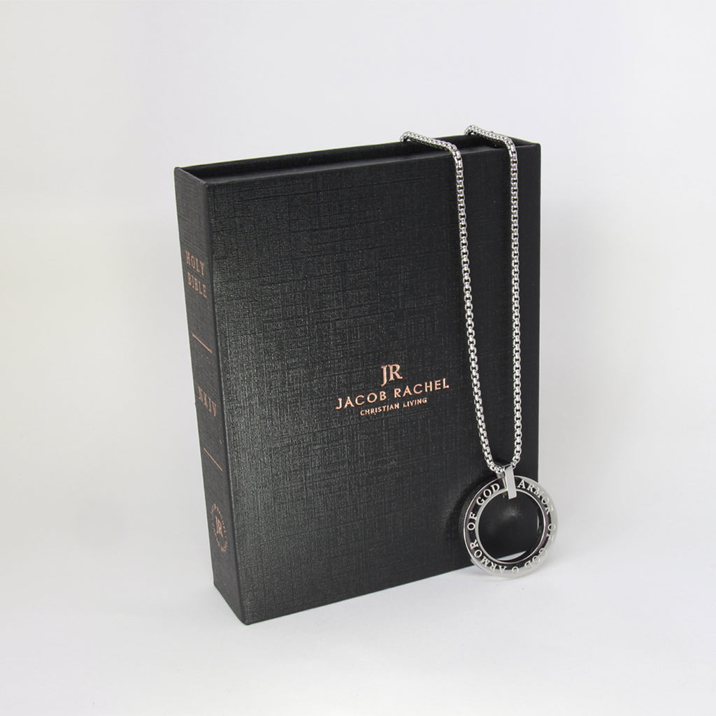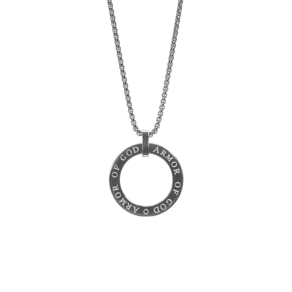 This ring pendant has no beginning or end; it signifies unity created through a desire of God. Engraved with the words "ARMOR OF GOD", we are reminded to put on His armor that we may fight the battles He has prepared us for.